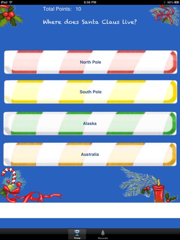 Take the trivia test and earn points to decorate the Christmas tree, with tons of awesome ornaments.