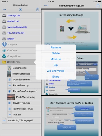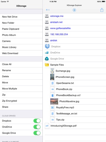 XStorage provides extra storage for iPhones and iPads. It is the best and most easy to use file & folder management app. It supports wifi WebDav protocol and most wifi drives on the market. By installing the XStorage server (download free at www.xstorage.me), it will turn your PC and Laptop into companion storage. It is also integrated with the popular cloud drives such as Dropbox, SkyDrive and GoogleDrive, and can browse and exchange files with these cloud drives contents.
