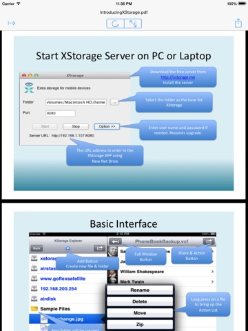 Because iPhone and iPad have expensive and limit amount of flash memory, photos and videos can fill up their storage quickly. Yet your PC and Laptop and USB drives provide almost unlimited amount of storage. Simply download install the XStorage server, or use any wifi drives on the market, your have created a companion storage for your iPhone and iPad, and files including photos, video and music can be transferred between them easily using any wifi network. It is quick to set up, and extremely easy to use.