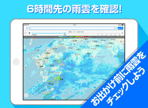 好評の雨雲レーダー機能では最大6時間先までの雨雲の動きがわかります。