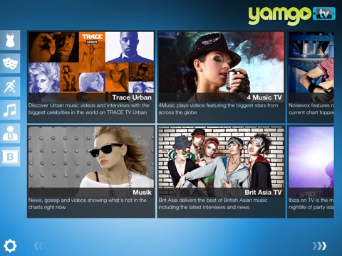 The Yamgo Free TV iPad app allows you to watch your favourite TV channels anytime and anywhere you like. With Yamgo you can enjoy free TV streams from channels like Zee Café, 9XM, Bollywood Hungama, TRACE Sports, Aaj Tak, Fashion TV and many more.