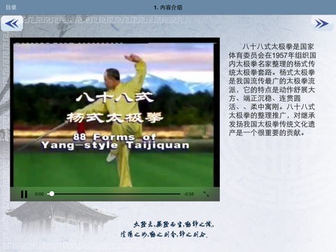 产品示范视频由著名太极拳名家李德印先生主讲,宗维洁女士分组示范。动作规范精准,教学方式直观有效,通过多层次演讲和讲解确保练习的准确性;教学采用对整套动作分段完整演练,分解教学和动作要点提示相结合的教学方式,使练习者直观领悟到太极拳法中手法、腿法等习练要领;产品还配有杨式太极拳相关简介和文化及八十八式太极拳拳式文字说明,便于理解。