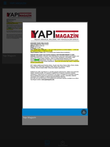 2003 yılında yayın hayatına başlayan YAPI MAGAZİN DERGİSİ 13 yıldır sektörde; müteahhitlere, mimarlara, inşaat mühendislerine, hazır beton üretimi yapan tesislere, yapı-inşaat malzemeleri üretici ve satıcılarına, resmi kurumlara, belediyelere, üniversitelere, sektör derneklerine, 5 yıldızlı otellere, bankalara, yurtiçi ve yurtdışı fuarlarda dergimizin hedef kitlesine ÜCRETSİZ dağıtılmaktadır. Orta Doğu ve Türki Cumhuriyetler de düzenlenen yapı ve yapıyla alakalı hemen hemen bütün fuarlara katılmaktadır. Bunun yanı sıra 60.000 toplu maille E- Dergi olarak adreslere gönderilmektedir.