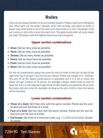 - If you wish to remember the rules of the game , go to " rules" , all will be explained in detail for you to become a pro at yatzy.