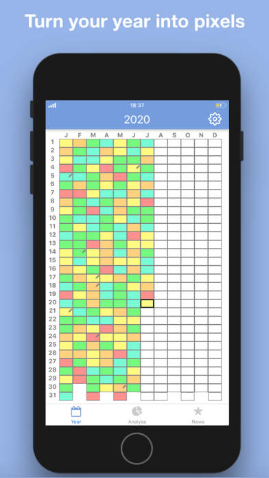 It’s time for another colorful year. You can now put an end to the passive and old-school diaries. If you want an active bullet journal that doesnt just listen to you but gives you feedback and analyses of your moods you have come to the right place. Simply select a mood each day and watch your year turn into pixels.