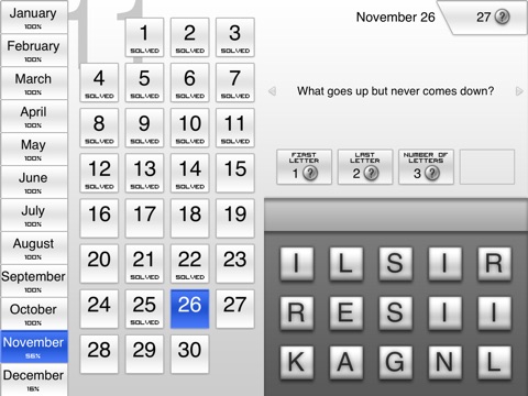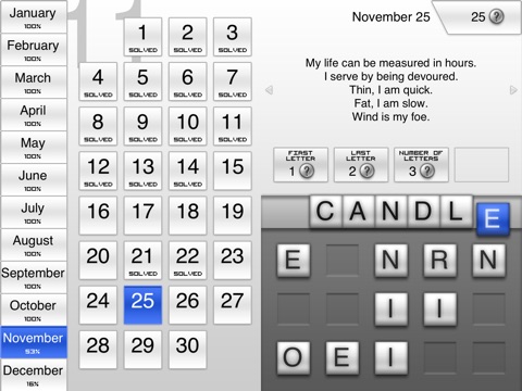 This game has one riddle for each day of the year. All of them are accessible right away, for you to play at your own rhythm.