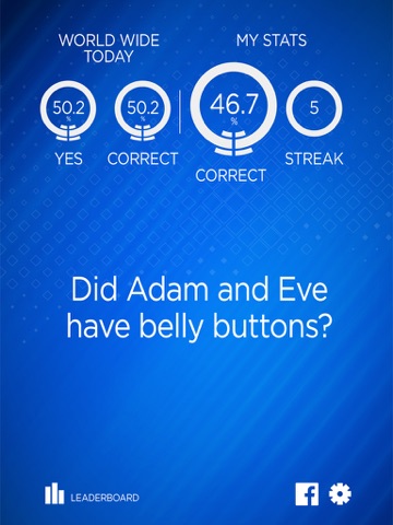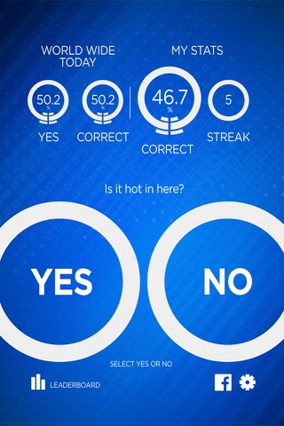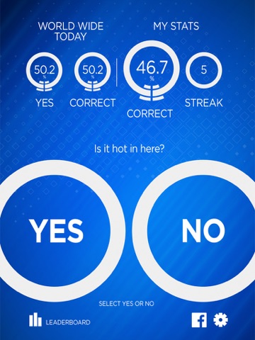 So what makes an answer "correct"? Majority rule of course. All user answers are tabulated and if more users answer Yes, then the correct answer is Yes. If more users answer No, then the correct answer is No. This is your way to make a difference in the world. Your voice will be heard, metaphorically speaking, since this app has no voice functionality.