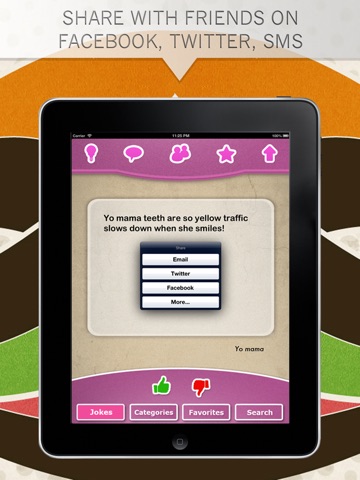 One of the jokes i really like! Yo mama fat she rolled of a quarter and made a dollar! Yo mama teeths are so yellow traffic slows down when she smiles Buy this app if u want more!