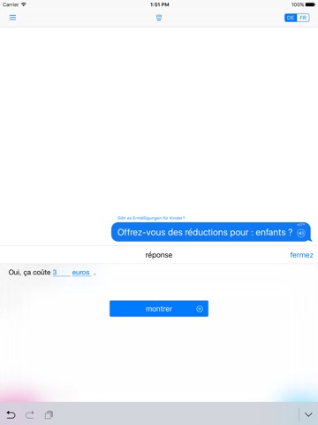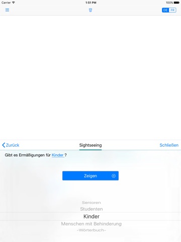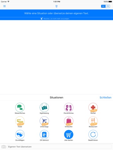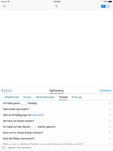 Mit ein paar Taps und Swipes kannst Du die gewünschten Sätze zusammenstellen. Die wichtigsten Sätze sind in Szenarien (Shopping, Hotel, Restaurant, Unterwegs, Essentielles, Sightseeing, Notfall und Persönliches) zusammengefasst und damit leicht zu finden