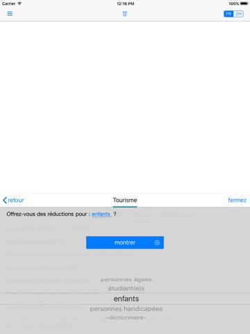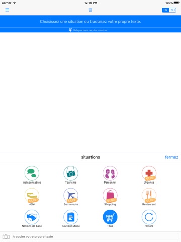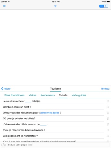 Vous pouvez aussi créer vos propres phrases en quelques clics. Les phrases les plus importantes sont regroupées en différents scénarios (shopping, hôtel, sur le chemin, personnel, tourisme et indispensables) pour une navigation simple.