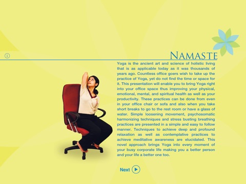 Yoga is the ancient art and science of holistic living that is as applicable today as it was thousands of years ago. Countless office goers wish to take up the practice of Yoga, yet do not find the time or space for it. This presentation will enable you to bring Yoga right into your office space thus improving your physical, emotional, mental and spiritual health as well as your productivity. These practices can be done from even in your office chair or sofa and also when you take short breaks to go to the rest room or have a glass of water. Simple loosening movements, Psychosomatic harmonizing techniques and stress busting breathing practices are presented in a simple and easy to follow manner. Techniques to achieve meditative awareness are elucidated. This novel approach bring Yoga into every moment of your busy corporate life making you a better person and your life a better one too.