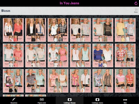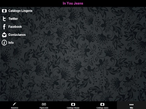 Nosotros, Página web, Catálogo Blusas, Catálogo Jeans, Catálogo Lingerie, Twitter, Facebook, Contáctanos