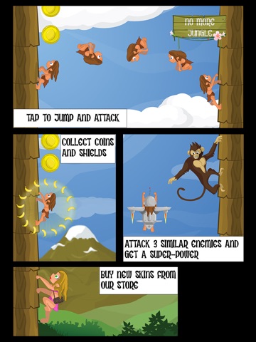Take down three enemies of the same kind in order to trigger mega-jump bonuses! Collect banana shields to plow through your opponents in style! But remember to watch out for bamboo signs with different messages, red agile monkeys, parrots and gorillas because they will knock you off and send you to your tropical doom!