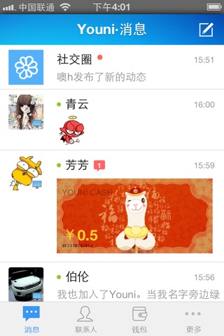 Youni(有你)是一款基于手机通讯录,跨平台、跨网络、跨运营商,且具有移动支付功能的社交工具,支持通过手机网络发送文字、图片、语音及短视频。您可以通过Youni有你与手机通讯录中的Youni联系人随时随地发送消息,甚至发钱。