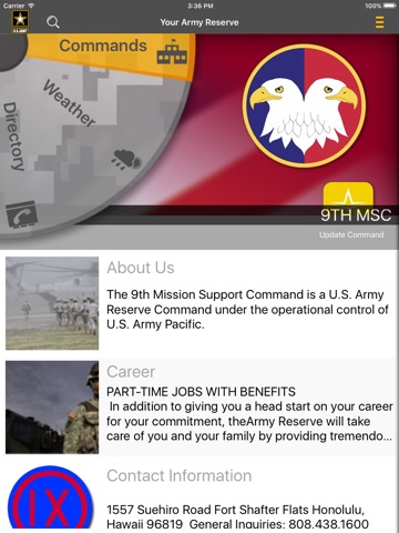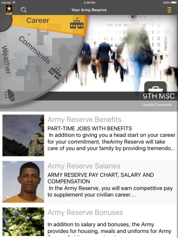 The free Your Army Reserve app is your No. 1 information source for regional United States Army Reserve commands, relocation, jobs and other opportunities for United States Army Reserve members. This new mobile app delivers up-to-the-minute info, direct from the U.S. Army Commands themselves. It also syncs in real time with the Your Army Reserve website and includes push notifications from commands sent directly to United States Army Reserve members who have the app. Additionally, you can find information on special events, command facilities, education and schools, medical services, retirement services, important phone numbers and much more — all at your fingertips.