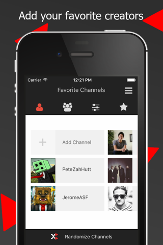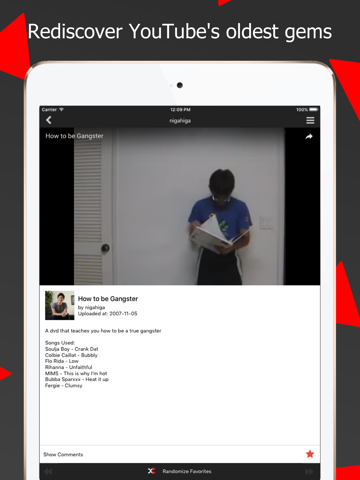 Add any channel to your own list of favorites to shuffle from. Enter a creators username, add it to your list and tap their name to instantly shuffle between all of their uploads. From there you can view all of the videos details and read comments.