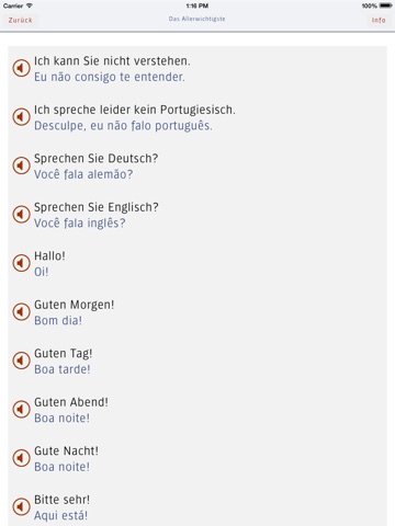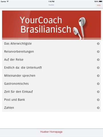 Wählen Sie dann gegebenenfalls das gewünschte Unterkapitel aus . Wenn Sie nun auf eine Wendung tippen, hören Sie automatisch die Audioaufnahme. Einfacher geht es nicht! Viel Spaß mit YourCoach Brasilianisch!