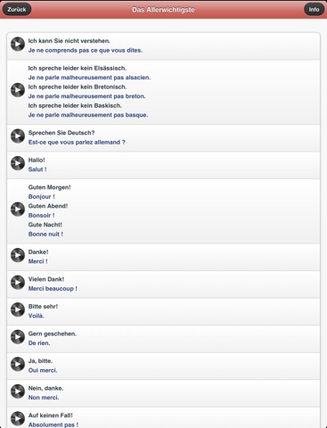 Wählen Sie dann gegebenenfalls das gewünschte Unterkapitel aus . Wenn Sie nun auf eine Wendung tippen, hören Sie automatisch die Audioaufnahme. Einfacher geht es nicht! Viel Spaß mit YourCoach Französisch!