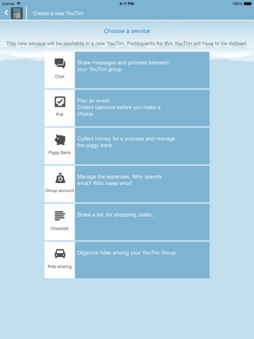 Create a YouTim to chat as a group, share an agenda or a checklist, organise a poll, set up a fundraiser, take charge of your week-end with your friends or organise a trip with others...