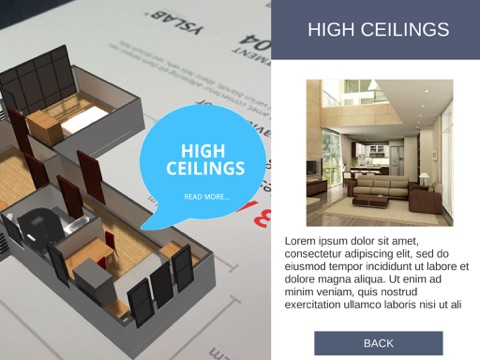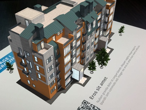 Launch the app and point the camera of your mobile device at the printed apartment floor plan. Welcome to augmented reality. Now you can see the apartment in 3D. Just turn the sheet of paper around to view it from different angles.