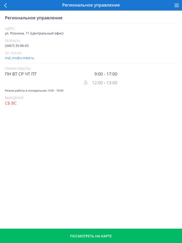 - Получать актуальную информацио о ближайших офисах Югории-Мед и о всех больницах в вашем населенном пункте, а также посмотреть их местоположение на карте