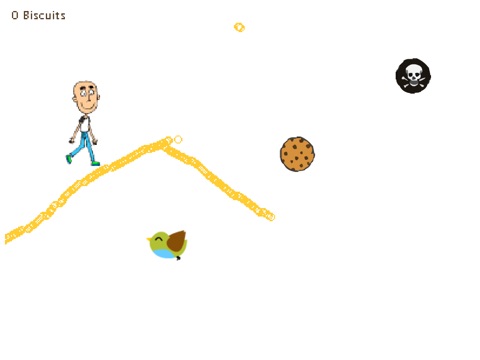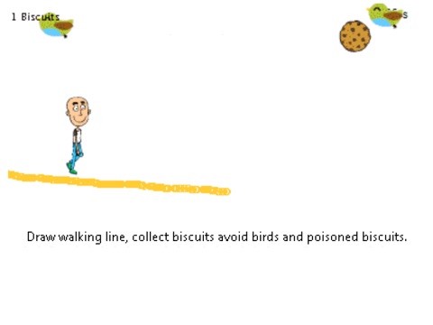 Draw walking line, collect biscuits avoid birds and poisoned biscuits.