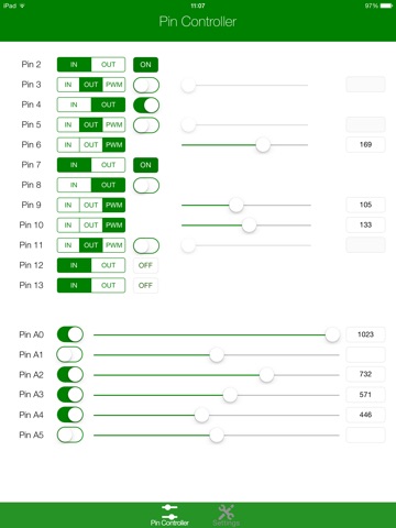 The Yún Controller app allows you to control the digital pins and monitor the analog pins of your Arduino Yún board wirelessly. Every single digital pin can be configured as INPUT and OUTPUT. Some of them even as PWM to emulate an analog output.