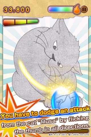This game is the casual game which competes for a high score between users with a 50 seconds time limit. You have to dodge an attack from the cat "Musa" by flicking the thumb in all directions. In order to get high scores, you need to dodge his attack in a row. You can enjoy this gaming app comfortably with various items.