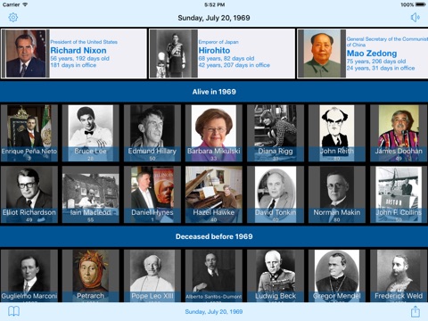 For each YYesterday we show you who was in political office, who was alive, who was deceased, and who would be born in the future.