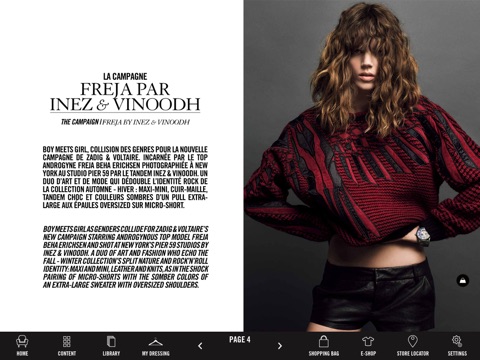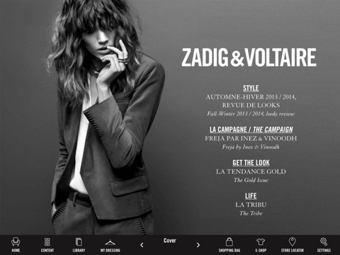 On découvre lunivers Zadig & Voltaire, la nouvelle collection, les hits de la marque... Une appli interactive sympa qui permet même de faire son shopping. Bref à chaque numéro, on a envie de tout acheter!