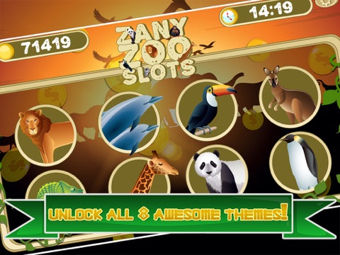 Zany Zoo Slot is a fun and addictive game that simulates a real multi-line slot machine with 8 different worlds and themes that you can unlock.