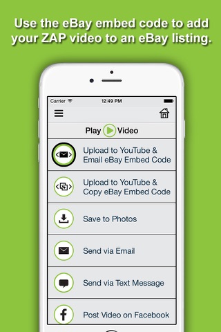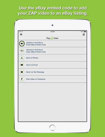 5. Upload your listing video to YouTube right from the app and email or copy the automatically generated eBay embed code to add it to your eBay listing, or share your ZAP listing video via email, text, and social networks to increase awareness of your listing.
