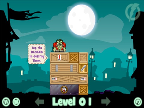 Drop the Zombie down onto a metal block by destroying all the other Blocks. Once all the blocks are gone and the Zombie is on a metal block press the ZAPPER button to ZAP IT.