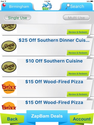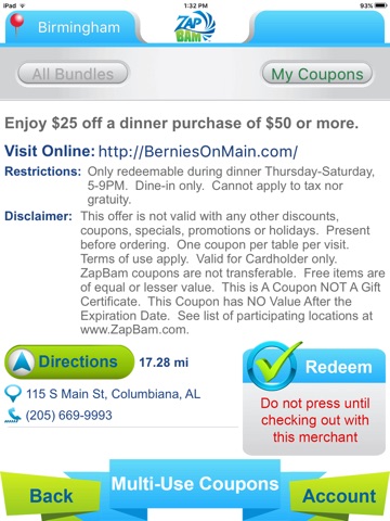 Once you download the App you will be asked to register so that we can set up a user account to track your coupons and redemptions. You can then browse our savings bundles to find the merchant offers in your area. If you bought your bundle through one of our Zapbam fundraising partners, you will be able to enter your redemption code for the bundle of choice and receive instant access to your coupons. You can also share our digital deals with your friends via Facebook, Twitter, Email or Text.