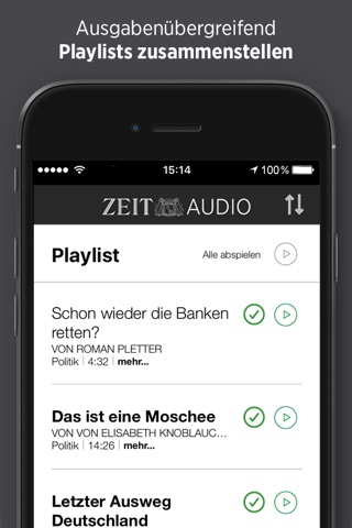 Da ich bisher keine (für mich) vernünftige Lösung gefunden App das Zeit Audio Angebot als podcast zu nutzen, freue ich mich umso mehr über diese App. Die Artikel sind übersichtlich nach Ausgaben sortiert und haben jeweils die Unterüberschrift als Kurzbeschreibung. Man kann alle Artikel auch im Voraus herunterladen und ist somit nicht auf Streaming unterwegs (und somit auf das Mobilfunknetz) angewiesen. Das einzige was ich noch vermisse ist eine 15 Sekunden Vor- und Rücksprung Funktion wie man es mittlerweile von allen gängigen Audio Apps kennt.
