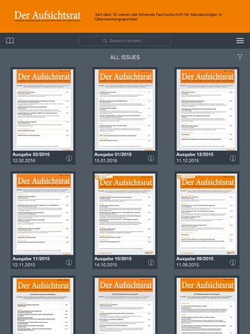 Print-Abonnenten von „Der Aufsichtsrat“ können die Ausgaben in 2015 kostenlos herunterladen. Hierfür klicken Sie in der Steuerungsleiste der App rechts oben auf „Abonummer eingeben“ und geben Ihre Abonummer ein. Ihre Abonummer finden Sie auf dem Adressaufkleber jeder Ausgabe und auf der Rechnung Ihres Heft-Abonnements.