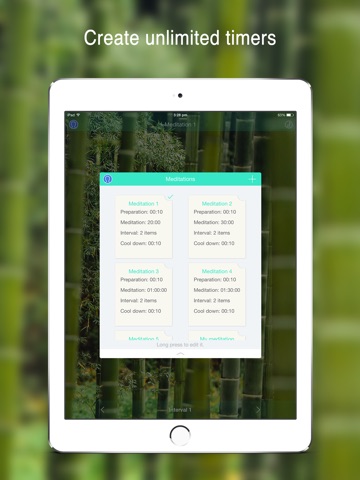 It has four default timers and you can create and custom your own timers. You can custom the preparation time, meditation time, interval number & interval time (each interval time can be different), cool down time. 18 free sounds are available to be chosen as switch interval alert sound.