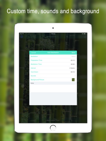 ⁃ Custom preparation time, meditation time, interval number, interval time, cool down time and background picture.