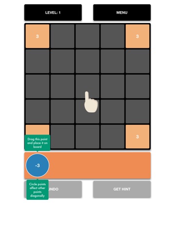 This game is designed to test your math skills! In each level you have to set the value of all the tiles on the board to zero by placing a number of tiles in the right positions. Blue circles affect tiles in diagonal directions from the point where they are placed. Green squares affect tiles both in horizontal and vertical directions.