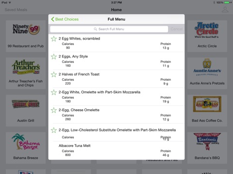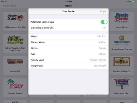 It will also display the calorie and protein content of all of the restaurant’s menu items, highlighting the ones that have fewer calories than your goal. You can build your own meal by combining multiple items and see how the calories total up.