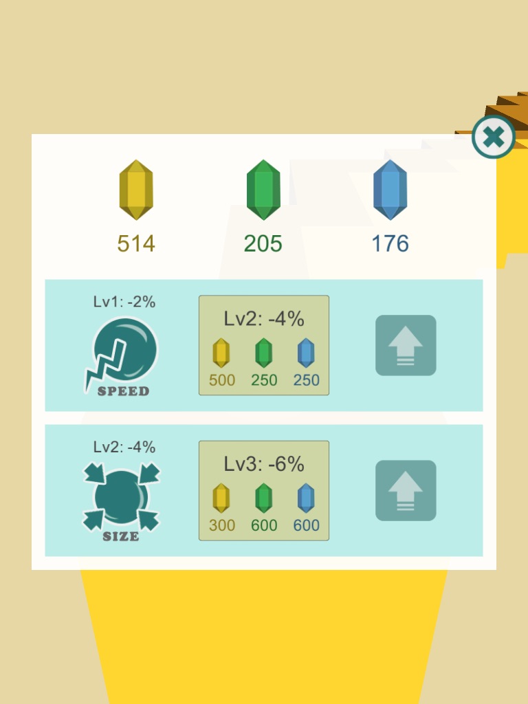 You can upgrade the speed and size of the ball from 3 different color crystals.