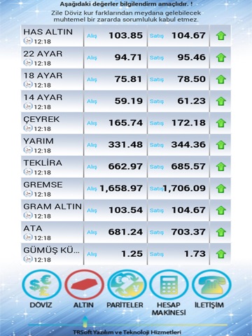 Ayrıca HAS ALTIN, 22 AYAR,18 AYAR,14 AYAR,ÇEYREK,YARIM,TEKLİRA,GREMSE,GRAM ALTIN,ATA,GÜMÜŞ KÜLÇE ve ONS fiyatlarını görebilir ve hesap makinesi yardımı ile hesaplama yapabilirsiniz..