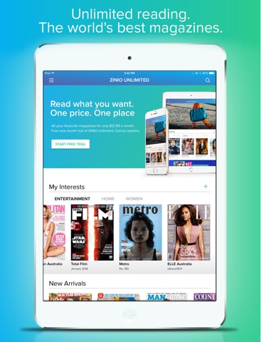 The app for those who love reading. ZINIO Unlimited is an all you can read model that will provide full access to 5,000+ magazines for only $9.99 a month. Ready to get started? Try it now and enjoy the first month for FREE! No commitment, you can cancel it at any time, during the free trial, or during the paid subscription.