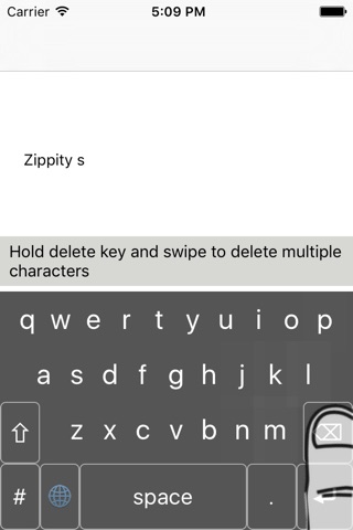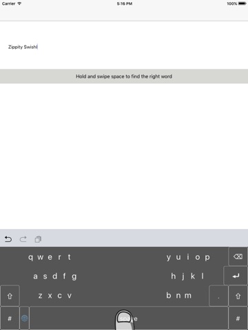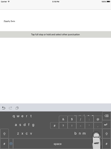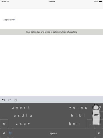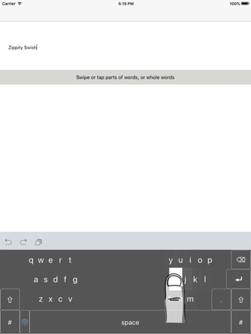 Zippity Swish is a tap and swipe keyboard designed for two thumb use. Swipe or tap either parts of words or whole words - you do not need to swipe a whole word in one touch. Autocorrected words can be cycled through by holding and dragging on the space bar. Delete multiple characters by holding and dragging the delete key. Quick punctuation pop ups can be used by pressing full stop and letting go over the desired punctuation mark. Multiple keypad popover keypads for numbers and symbols.