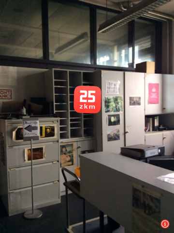 The videos overlay the live image of the camera of the mobile device and, if the device is held at eye level, the first video opens up. In order to move ahead in the history of the ZKM, one has to turn in clockwise direction, which activates the next video in the timeline.