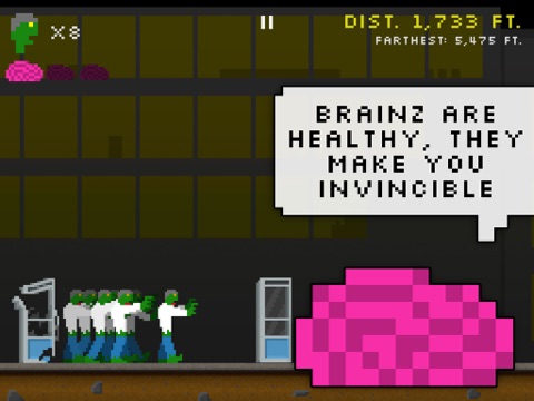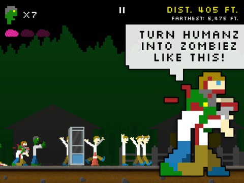 Eating brains is healthy for zombies. Eat 3 brains and your zombies will become bigger, badder and faster, and they can obliterate everything in their path. Collect human heads to get helpful bonuses such as more zombies, encounter more humans, encounter more brains and faster big zombies.