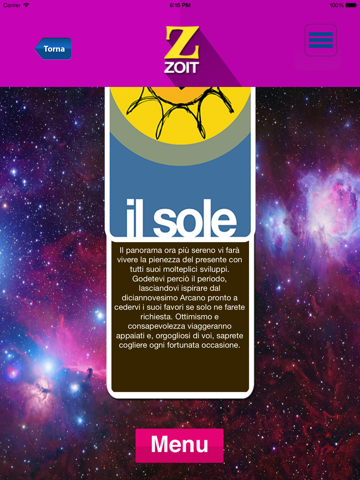 Attraverso il menu principale l’utente ha la possibilità di consultare i tarocchi scegliendo tra cinque categorie diverse: