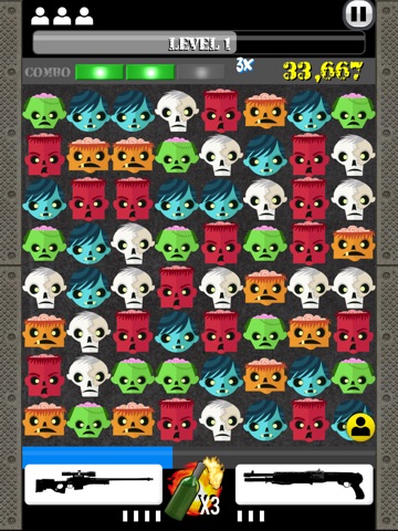 Match three zombies and tap away to take them out! Get special weapons, ammo, and combos to gain high scores and higher levels!