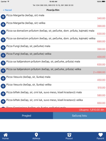 - Pregled hrane izabranog restorana i cenovnik