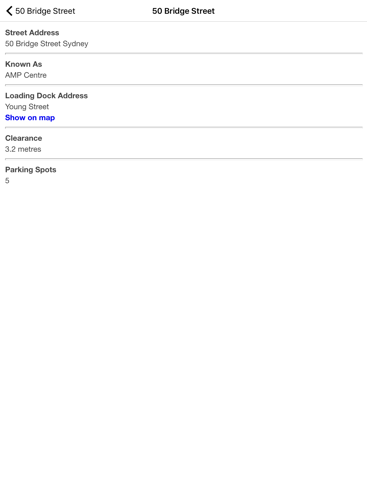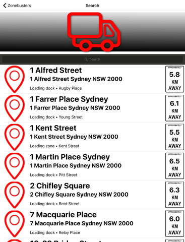 For example, you search for AMP Centre, or 50 Bridge Street, and Zonebusters tells you the loading dock is in Young Street. It also tells you the clearance in metres and the number of parking spots. You can even get driving directions.